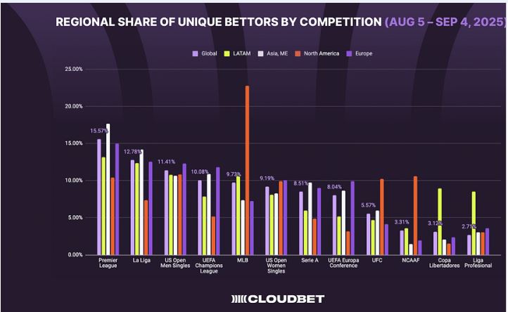 Leading crypto sportsbook and casino Cloudbet has released the first edition of Cloudbet Snapshot: Regional Crypto Betting Trends, a new series designed to track how bettors worldwide engage with their favorite sports. This inaugural snapshot, covering August to September 2025, analyzes betting activity across 12 of the most popular competitions—a curated slice from the thousands of events available on Cloudbet every day. The findings provide one of the clearest looks yet at regional betting behaviors during a peak period spanning the start of European soccer seasons, the US Open tennis championships, and the MLB playoff race.