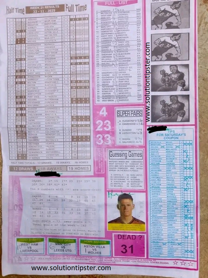 For Pools Live Results, Advance fixtures, Weekly Pools Tips and more, check – Poolsupdate.com