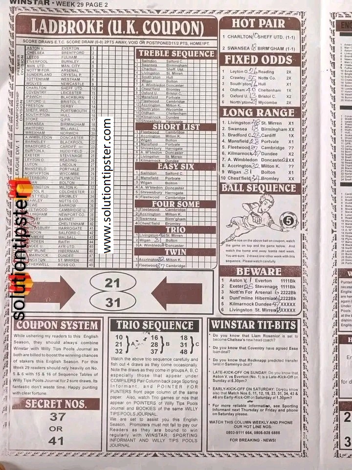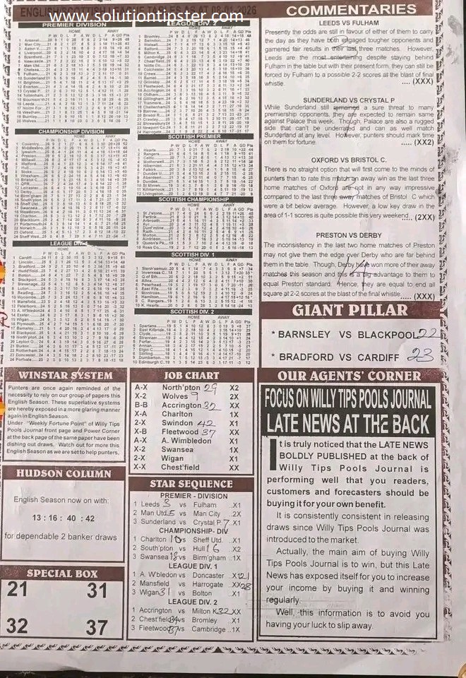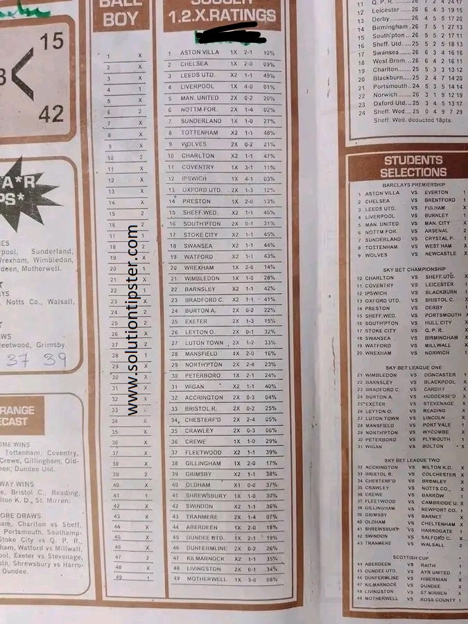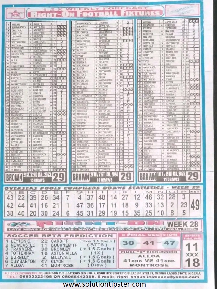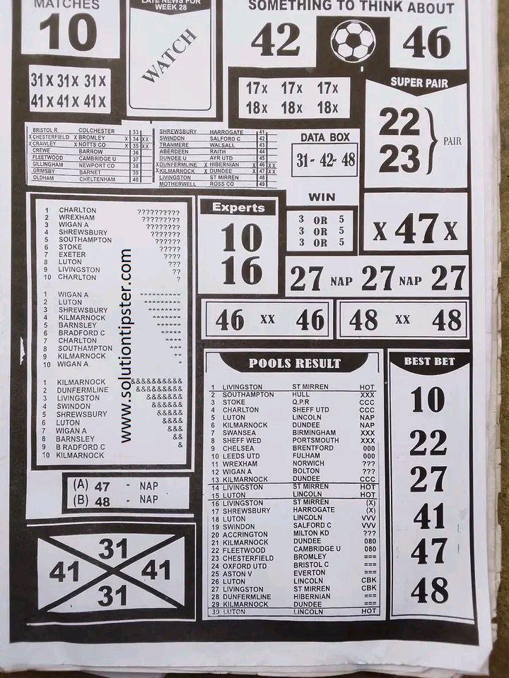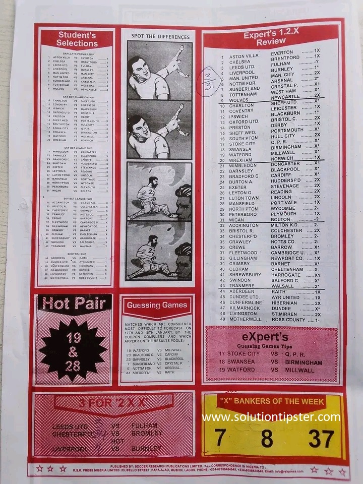 Here, we publish weekly and current Pool Fixtures Papers, Pools RSK papers and other forecasting papers for your forecast and winning pleasure. Click on the images to view them more clearly.